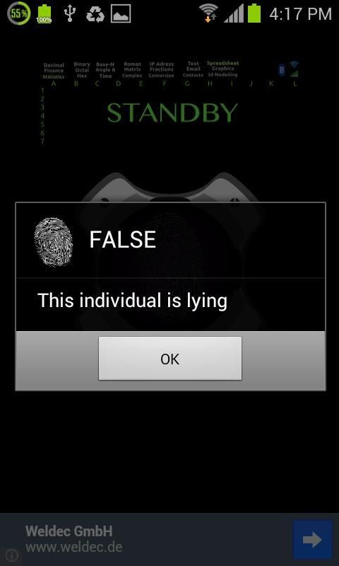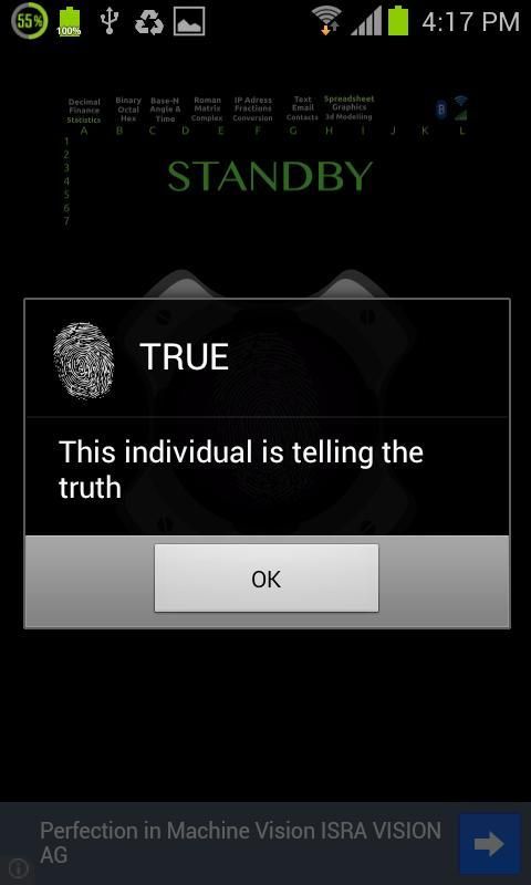 Ini adalah sebuah aplikasi yang dapat mendeteksi kebohongan melaluhi layar sentuh dan dengan mendeteksi perubahan fisik yang sedang terjadi pada tubuh seseorang yang sedang di-interogasi.
