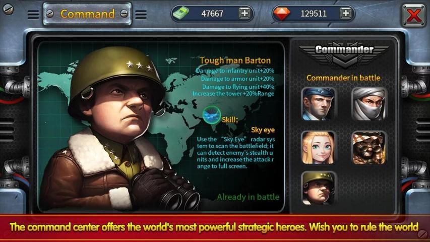 -Anda Akan memiliki 10 komandan Perang Dunia II, yang dapat membantu Anda memperkuat properti menara Anda.