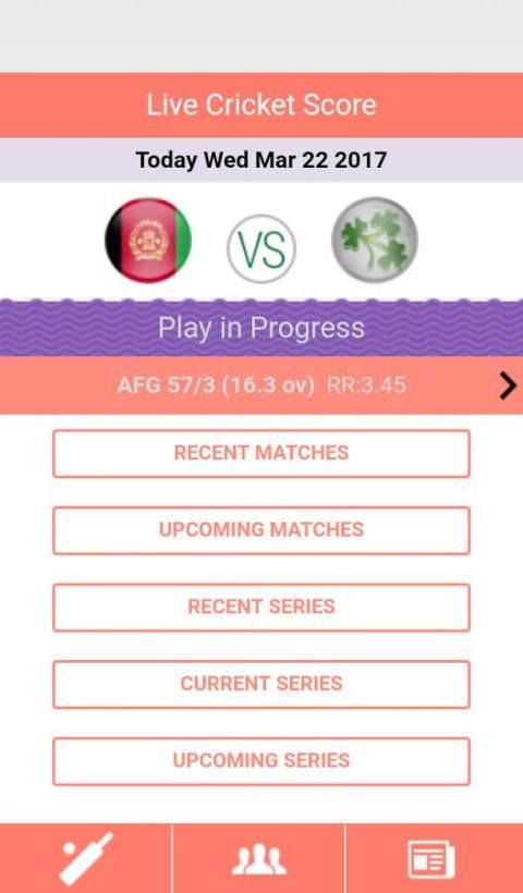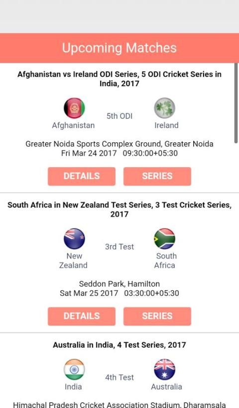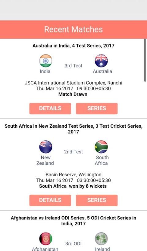skor kriket hidup meliputi cakupan yang lengkap dari semua kriket internasional, ICC Piala Dunia, ICC Dunia T20, Pertandingan Uji, Asia