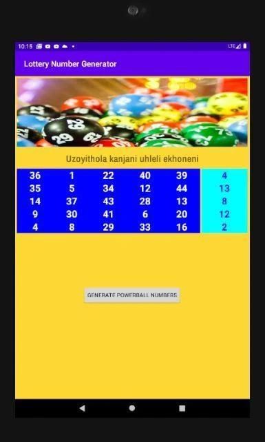 Aplikasi ini menghasilkan 5 set garis untuk Lotto dan PowerBall. Ini menghasilkan angka acak dari 1 hingga 52 untuk entri Lotto dan 1 hingga 50 untuk entri PowerBAll.