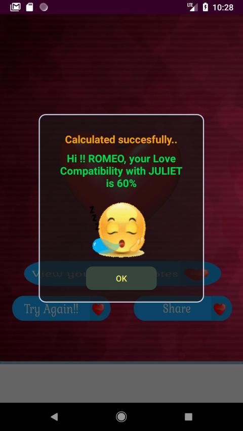 Play this free love test calculator app on your friends, your beloved partner or share your love match result with them by sharing it.