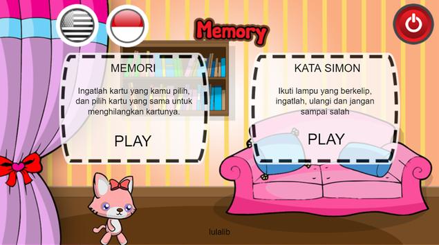 Game Edukasi untuk melatih daya ingat anak-anak. Game ini di kembangkan untuk anak-anak pra sekolah atau anak TK, terdiri dari berapa modul pembelajaran : - Mencocokan kartu. - Mengingat. Angel Anlee - Lulalib