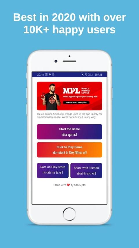 Disclaimer: This is an unofficial MPL game app. This is only a guide app to help you win money. We're not affiliated in any way to MPL or any other brands. This app is only provided for educational, reference and promotional purpose. Images used are only for promotional purpose. To report any illegal/copyright/trademark use of image or resources please contact us at info@codecyan.com.