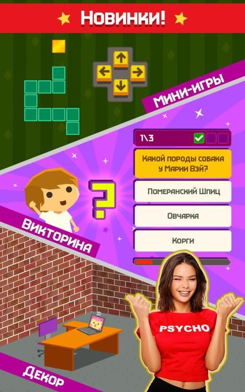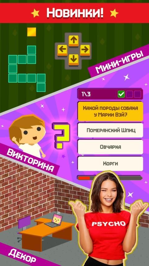 В приложение будет добавляться новая мебель - столы, стулья и другие предметы. Оборудование будет совершенствоваться - последние модели компьютеров, видеокамер и много другого. Следи за веяниями моды - внешний вид очень важен. Тут ты сможешь не просто убить время, а насладиться процессом! Играл в Угадай Блогера? Стань одним из них!