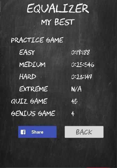 Setiap modus, Anda diperbolehkan untuk mengirimkan skor Anda dan melihat peringkat Anda dibandingkan dengan pengguna lain atau Anda dapat berbagi skor Anda di Facebook untuk memamerkan keterampilan matematika Anda. Anda juga dapat melihat kemajuan Anda pada setiap modus dengan memeriksa nilai Anda.