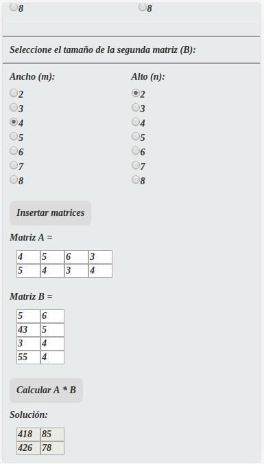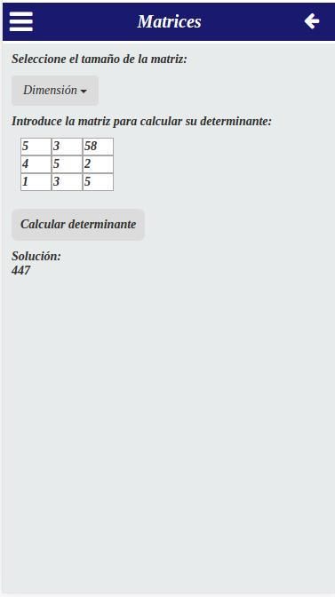 Selain itu, aplikasi berisi kalkulator yang memungkinkan Anda untuk melakukan operasi matriks. Fitur ini memungkinkan Anda menghindari harus melakukan perhitungan dengan tangan, atau periksa apakah perhitungan matriks yang Anda buat di atas kertas sudah benar. operasi matriks memungkinkan aplikasi adalah sebagai berikut: