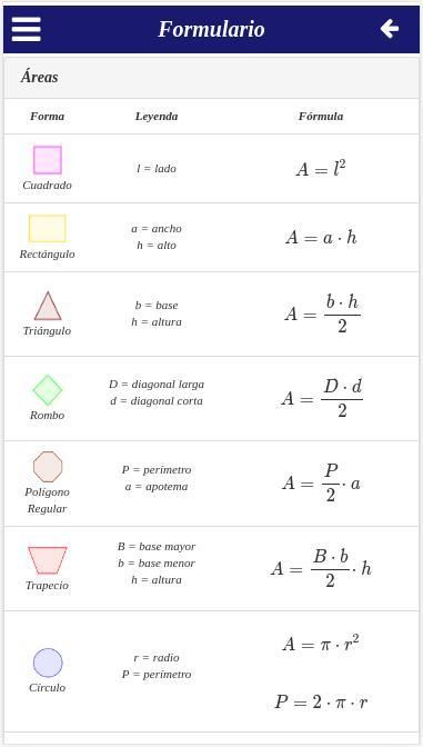 Untuk masing-masing daerah di atas Anda akan menemukan aplikasi di setiap jenis properti atau rumus matematika yang akan sangat berguna untuk memiliki di tangan ketika memecahkan masalah matematika, baik lembaga dan universitas.