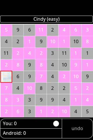 Game rules are very simple. Opponents take turns one after another. One walks on the horizontal, the second - vertically. The pink matrix cells are positive numbers and the grey - negative. The player must choose any non-blank cell in its row / column respectively, thus adding to their points the number in the cell. The game ends when any of the players can not make a move. The winner is the one who gathers the most points.