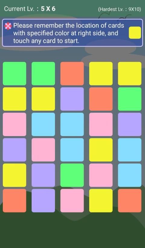 - Warna Lokasi: Ingat lokasi semua kartu, dan mencari tahu semua kartu warna yang ditentukan setelah mereka tertutup. Memiliki kali salah batas.