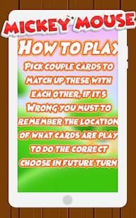 Memori Mickey Mouse Permainan adalah permainan teka-teki bagi pengguna android untuk meningkatkan memori. Ini adalah permainan menyenangkan dengan aktivitas bangunan memori seperti di setiap tingkat, pemain diwajibkan untuk tekan tombol persegi dan perlu menghafal apa di balik itu, dalam rangka untuk mencocokkan pasangannya. Jauhkan pencocokan objek dan menyelesaikan latihan memori ini dalam waktu minimum & klik.