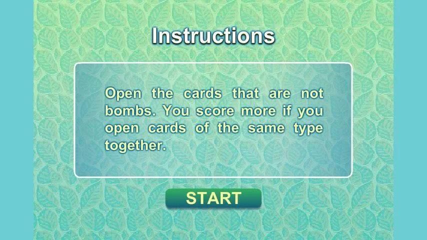 Dalam game ini akan ada grid kartu. Anda akan diberikan beberapa waktu melihat dan menghafal isi dari kartu dan setelah Anda merasa seperti Anda memeriksa kartu cukup lama mereka akan tertutup dan kemudian Anda akan perlu mengingat penempatan kartu, tetapi Anda perlu menghindari bom jika tidak, anda akan kehilangan permainan. Anda bisa mencetak lebih banyak jika Anda dapat mengingat posisi item yang sama dan kemudian membukanya bersama-sama. Karena permainan berlangsung akan ada kartu lebih dan lebih dan permainan akan lebih dan lebih menantang. Permainan ini adalah gratis.