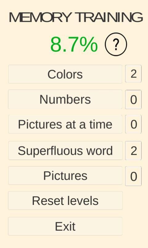 Ada lima jenis pelatihan memori dalam aplikasi. Setiap spesies akan menjadi lebih rumit saat lewat, karena peningkatan jumlah elemen, penurunan waktu yang dibutuhkan untuk menghafal mereka, dan sebagainya.