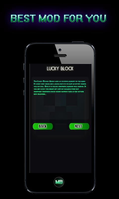 The Lucky Blok mod untuk Minecraft Pocket Edition menambahkan elemen menarik untuk permainan. Hal ini terlihat sangat banyak seperti blok tapi itu sebenarnya sebuah entitas yang dapat Anda membunuh. Setelah itu tewas sesuatu yang acak akan terjadi. Jika Anda beruntung Anda mungkin mendapatkan banyak barang berharga tapi kadang-kadang sesuatu yang jauh lebih buruk terjadi seperti pemijahan bos melayu.