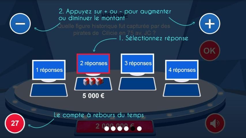 Sekarang Anda memiliki kesempatan untuk memenangkan Anda pertama juta (bahkan jika hanya virtual) dengan bantuan pengetahuan Anda. Menguji resistance kecerdasan Anda! Hanya 15 pertanyaan. Empat alternatif respon dan hanya tiga pelawak. Kesulitan dari pertanyaan meningkat dengan jumlah yang diusulkan. Teka-teki ini tidak untuk gugup dan bagi mereka yang tidak yakin pasukannya. Victorine mengandung 10.000 masalah!