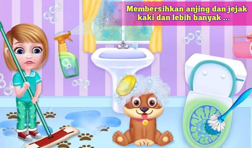 Memenuhi putri kecil kami di rumah dan membantunya untuk membersihkan rumah. Pilih dari lima kamar yang berbeda untuk membersihkan sebagai rumah besar dan membutuhkan bantuan Anda. Mulailah dengan kamar mandi di mana Anda harus membersihkan lantai dan membuatnya berkilau seperti baru. Anda juga dapat menikmati mandi busa dengan anjing freddy. Setelah menyelesaikan mandi Anda harus pergi ke kamar tidur berantakan untuk membersihkan mereka. Masukan mainan dalam kotak, vakum lantai, memperbaiki dinding dan menghias kamar tidur putri. Lalu pergi ke dapur dan mencuci piring, membersihkan meja, memperbaiki patah ubin dan juga menghiasi mereka. Ketika semuanya rapi dan bersih, kemudian memilih cat yang sempurna dan menghias kamar putri. Bermain dan menikmati ini rumah pembersihan permainan dan berbagi dengan teman-teman Anda.