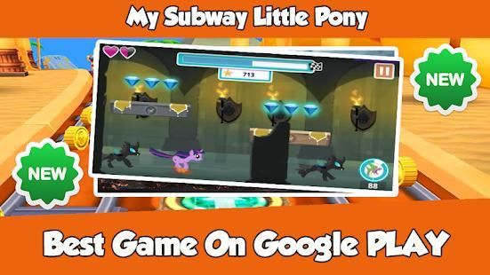 The hero little pony here is not the pony from the serie “My Little Pon Equest Girls” to be precise and has nothing to do with the ponys Character in the princess cartoon! As you can see there is.. here ? ! It is created for fun!! It is now available with so much fun. Run in the nature … Run in a fun world full of princesses girls adventures. Jump over My Subway Little Pony Adventure is easy to play, you can give it to your kids and you can play it too .The most important thing is to help the little Pony , this super hero to collect money and find the gold he lost. In a princesses world full of adventure, you should make sure, you run and jump correctly, that you don’t run on spikes and don’t hit obstacles and don’t stop or the enemies will get you. Use your smooth, easy moves to guide our pony on his adventure. What are you waiting for now just try?...Just download this copy of this amazing game.