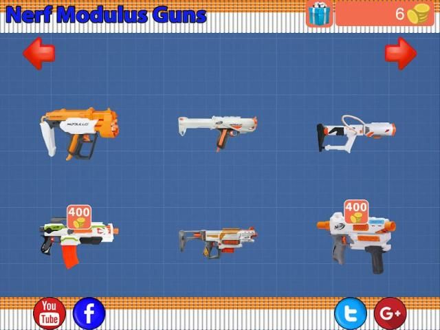 All the famous Nerf Modulus Guns like Modulus ECS-10, Blaster Stock, Battlescout ICS-10, Grip Blaster, IonFire, Tri-Strike, BarrelStrike, Regulator, StockShot, Stryfe, Mediator, Mediator Stock, Evader, Ghost Ops Evader .. are all simulated in the game.