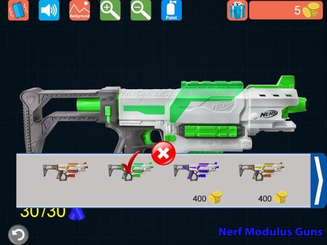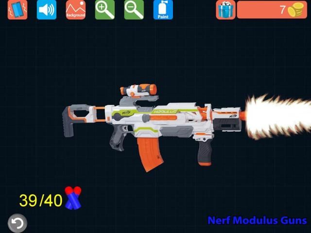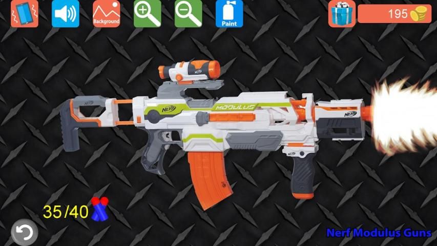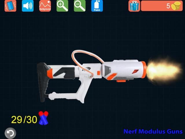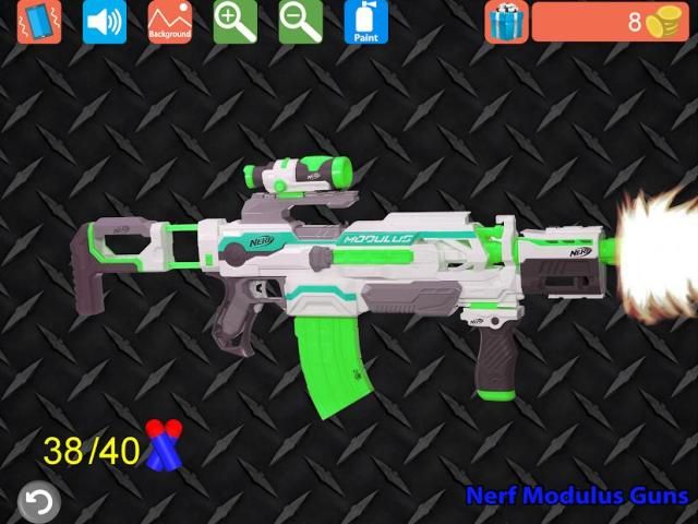 In Nerf Modulus Guns, you can use the Paint menu to paint nerf guns in the color of your choice. There are many colors for you to paint on the Toy gun. Create your own gun. Bring your Nerf gun advertising to your friends, so they can see how good you are.
