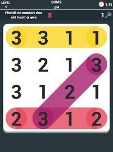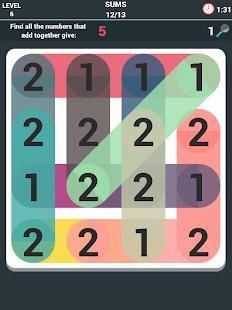 * Aturan permainan yang benar-benar sederhana. Tapi tugas setiap tingkat benar-benar menyenangkan dan menantang, menemukan semua angka yang menambah bersama-sama memberikan angka yang diberikan (sum)