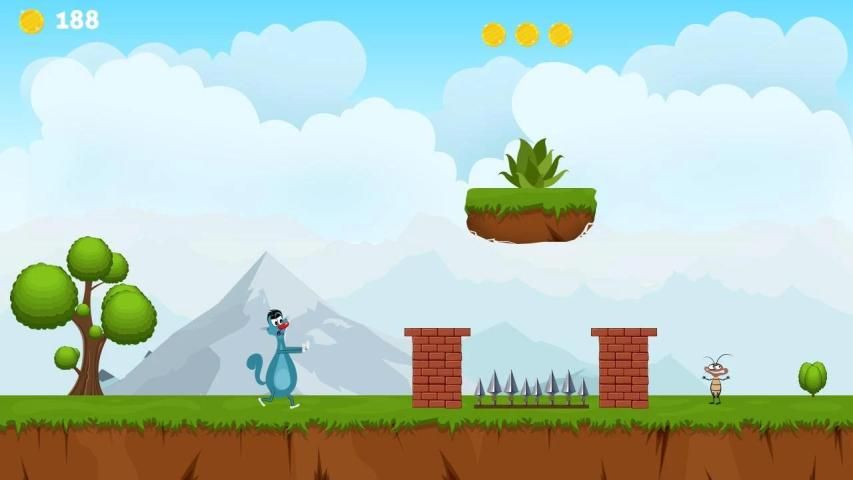 The oggy menjalankan anak-anak permainan dan menghindari rintangan atau musuh kecoa.