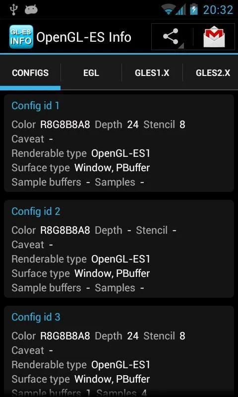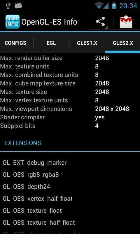 Info OpenGL-ES memungkinkan Anda melihat informasi yang relevan tentang implementasi OpenGL-ES perangkat Anda. Data tersebut meliputi: