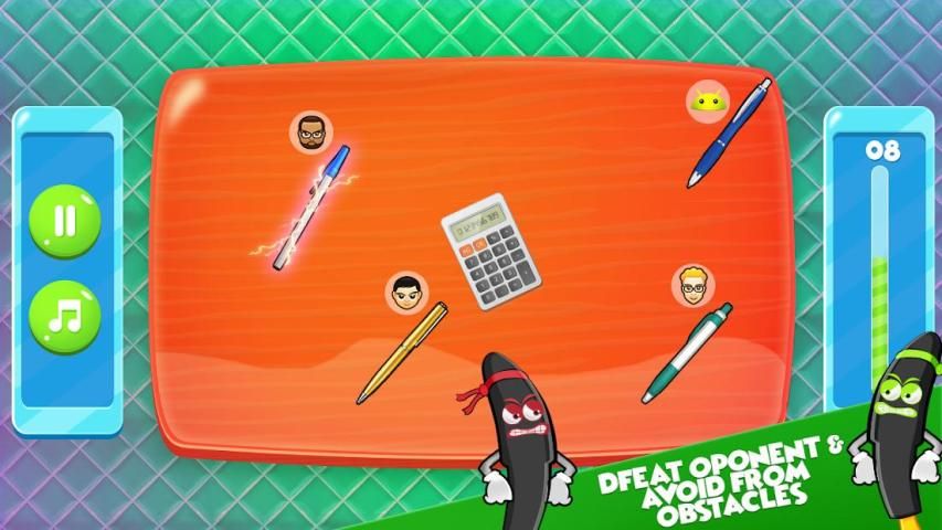 Choose a pen and begin the mighty fight with one, two or three opponents on the table. Swipe across the screen to hit the opponent’s pen, achieve coins after winning of each match, and unlock huger pens with your earnings.