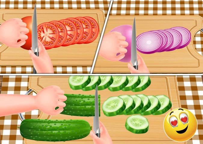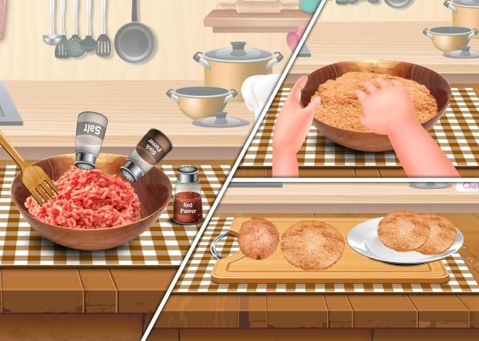 Burger is a type of Fast food consisting of one or more patties usually placed inside bun...Hamburger may contains variety of things as Cheese ,Vegetables,Patties or anything you want to add..Perfect Top Homemade burger needs Onions,Tomato,Cucumber and lettuce to add with beef or chicken patties....Cut these vegies in your own serving style...Be Careful as you don't cut your hand...Mincing Meat to make tasty Patties of Special Burgers...Add ingredients into the meat to make it more delicious and mouth watering burger....Mix all ingredients and make round patties of your hamburger...Fry these Patties into the oil....Fry it in low steam as it turns into golden brown...Now its time to assemble your burger.....take the bun...put tomato sauce onto the bun..now put your Tasty meat Patty....Add all the vegetables over the patty....Add cheese over these vegetables to make it more mouth watering.. Let's become a cook and serve your food lovers..Best fun game ever with fun kids. In burger shop you have Create you own taste with all little buddies...Become the real master chef of this world.. Practice your cooking skills and techniques with our original recipes....