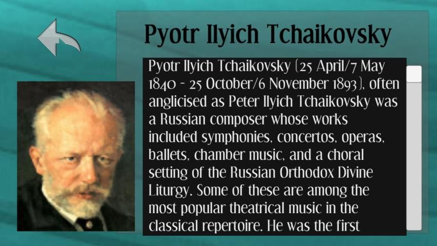 Piano app contains best pieces of music composed by Pyotr Tchaikovsky. Now you can master all his classical tunes!