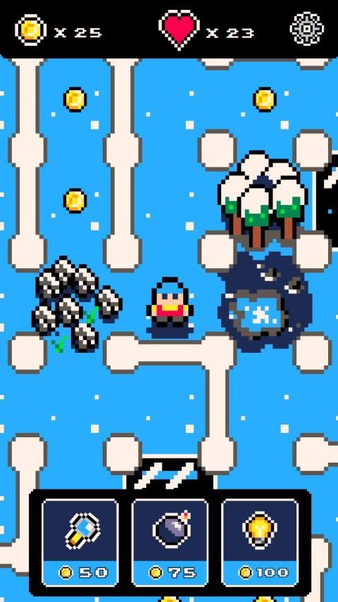 - 3 power-up: perkecil untuk melihat jalan keluar, meledak dinding dengan bom dan dapatkan tips untuk keluar;