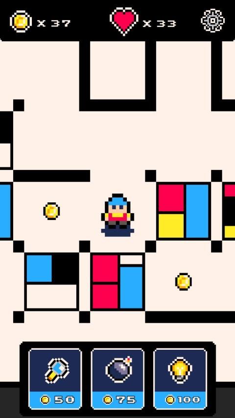 - 3 power-ups: zoom out to see the way out, explode walls with a bomb and get tips to the exit;