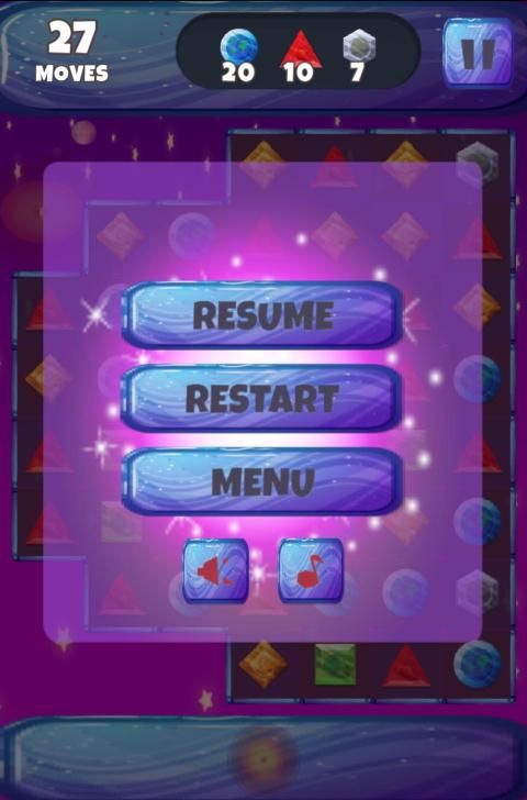 Your mission is move, swap, match 3 planet-jewel and collect all item that is on target in limit moves throung more 200 levels.