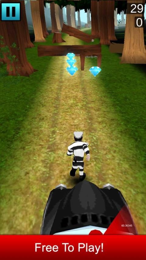 Jauhkan lari dari mobil polisi dan mengumpulkan berlian. Jalankan maju ke hutan dan melompati kawat dan hutan kayu.
