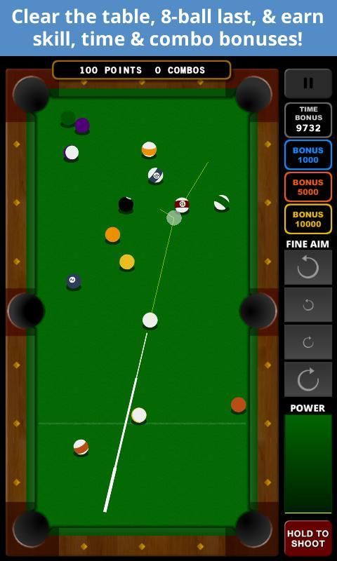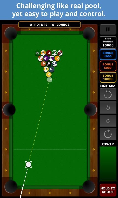 Kontrol: Sentuh di mana saja di atas meja untuk tujuan. Gunakan tombol tujuan menyempurnakan untuk sedikit menyesuaikan tujuan Anda untuk menembak yang lebih baik. Tahan dan lepaskan tombol Tembak pada tingkat daya yang diinginkan untuk mengambil gambar Anda.