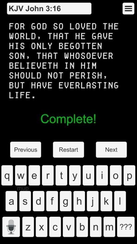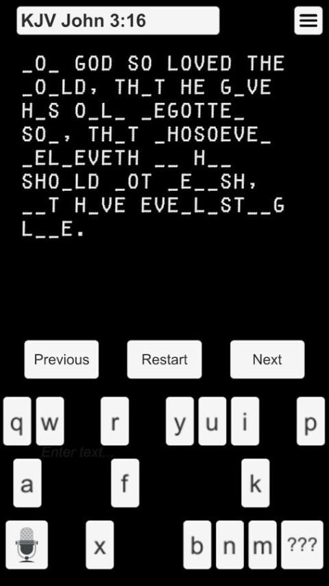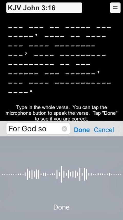 Menghafal KJV Alkitab dalam menyenangkan, algojo-gaya permainan. Perhatikan tombol menghilang saat Anda menebak huruf apa dalam ayat, atau menggunakan mikrofon Anda untuk membaca seluruh ayat dan kemudian melihat apakah Anda sudah benar.