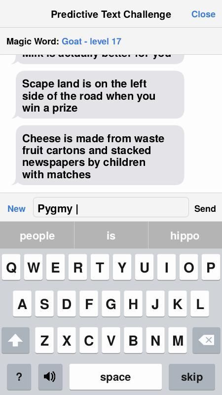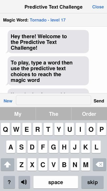 Dalam teks prediktif Tantangan, Anda diberi "Kata ajaib" dan mencoba untuk membangun kalimat dengan kata di dalamnya. Masalahnya adalah, Anda hanya bisa mengetik kata pertama. Setelah itu, Anda perlu untuk mengklik pada saran teks prediktif. Aplikasi ini didasarkan pada "The prediktif Text Challenge," Baik Mythical Pagi episode oleh Rhett dan Link. Cari "The prediktif Text Challenge" di YouTube untuk menemukan versi Rhett dan Link dari permainan. Selamat bersenang-senang!