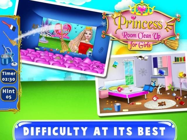 Let's clean up the princess room in royal style. Welcome to the new Princess House Cleaning Games for all you beautiful princesses who will enjoy this room cleaning games. One of the awesome room cleaning games for girls. We all love to cleanup the mess be it from our lives or from our houses, in this princess clean up game, clean up princess's room till she returns to her new clean and tidy room. This kids game will give you so much enjoyment that you will tell all of your friends too that you show your cleaning skill in this game and then they will play it too. Join us in this Princess Mission. Show your cleaning skills and tell your friends and everyone that you have best cleaning skills. There are lots of features in this princess room clean up game. You can clean the dust, clean the cobwebs, rearrange the toys, straighten the furniture, wall hangings, show pieces, etc, clean the dirty floor, wipe the glasses, etc