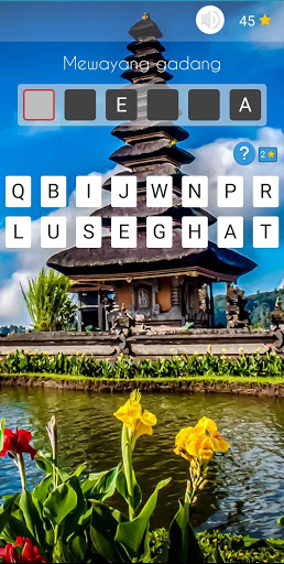 Tebaklah huruf yang tersembunyi dalam kotak, sehingga membentuk kata dalam bahasa Bali dari pertanyaan-pertanyaan sebanyak 40 buah. Quiz ini dibantu 2 kali hint dengan pemotongan nilai sebanyak 2 point jika menekan icon ? Jika salah, point anda akan terpotong sebanyak 5 points. Jika benar anda mendapatkan 10 points.