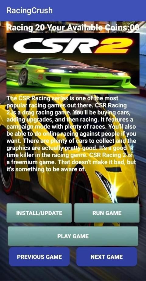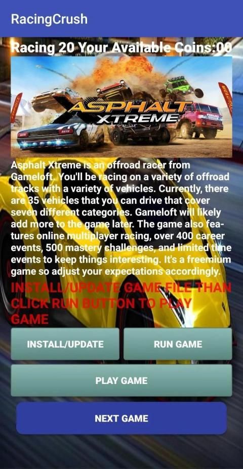 Racing Crush is great app for the racing games lover. who have great crush on racing games. it provide top 20 games in one app. It include racing games like "ASPHALT XTREME", "CSR2", "NEED FOR SPEED" and many more 16 games which you can enjoy installing this one app.
