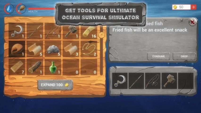 Kumpulkan sumber daya untuk bertahan hidup di laut terbuka. Buat dengan cara klasik (dengan memetik bagian terdalam) atau dengan kail, berdiri di atas rakit selama bertahan hidup di air.
