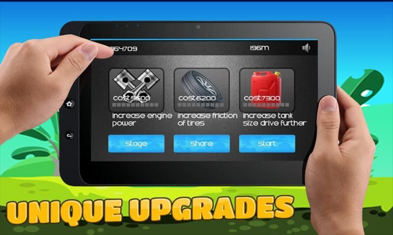 - Upgradeable parts include engine power, tires friction, and tank size