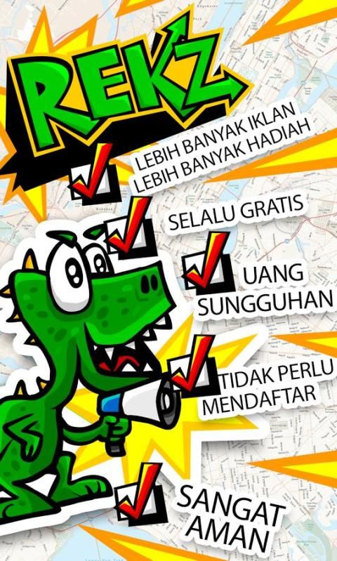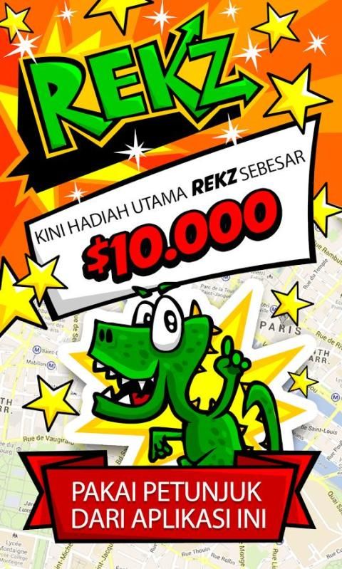 Rekz adalah game lotere online gratis sederhana yang baru untuk seluruh anggota keluarga, tempatmu bisa menemukan dan memenangkan uang dari Google Map. Kamu hanya harus memperbesar peta sampai ikon Rekz berubah menjadi hijau, lalu temukan Rekz atau telurnya. Kemudian tekan telur atau Rekz yang kamu temukan. Bagikan kemenanganmu dan dapatkan uangnya!