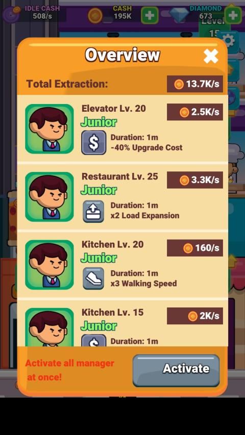 In the game, you need to hire a professional chef and manager to automate the restaurant's workflow. It can help you make money even when you are offline. Thereby expanding the scale of the restaurant and expanding your business empire! Explore the best business strategies, challenge other restaurant tycoons and earn more cash!
