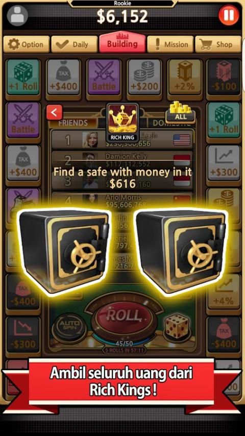 Kamu dapat bersaing dan melihat ranking semua pemain di seluruh dunia dalam Rich King.
