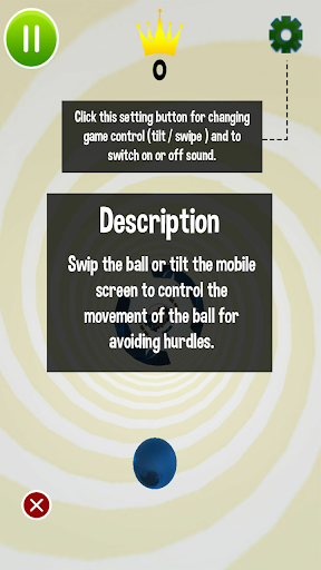 Ada dua Opsi untuk Mengontrol Goyangan dan Tilt Bola. Klik atau Geser bola ke kiri atau kanan dan Tilt untuk menghindari semua rintangan dan cobalah untuk tidak menabrak rintangan! Tantangan adalah kecepatan Anda dengan irama Waktu dan mencoba yang terbaik untuk menang!