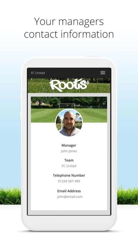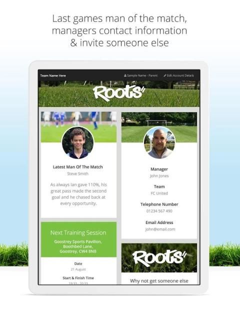 Membiarkan semua orang yang terlibat tahu di mana dan kapan pertandingan berikutnya atau pelatihan sesi dan jika pada atau off (tidak lebih menyalakan di lapangan sepi berteriak 'mengapa tidak seseorang membiarkan saya tahu itu off'). Akar dirancang untuk menjadi sederhana dan mudah digunakan, Anda tidak akan menemukan tak berujung daftar perlengkapan, statistik pemain, laporan pertandingan panjang lebar dan fitur pengembangan pemain yang tidak perlu kita hanya ingin semua orang dari segala usia dan kemampuan untuk menikmati bermain permainan indah dan siapa tahu di mana ia akan membawa kita. Ini hanya mengambil detik untuk mengatur akun Roots Anda.