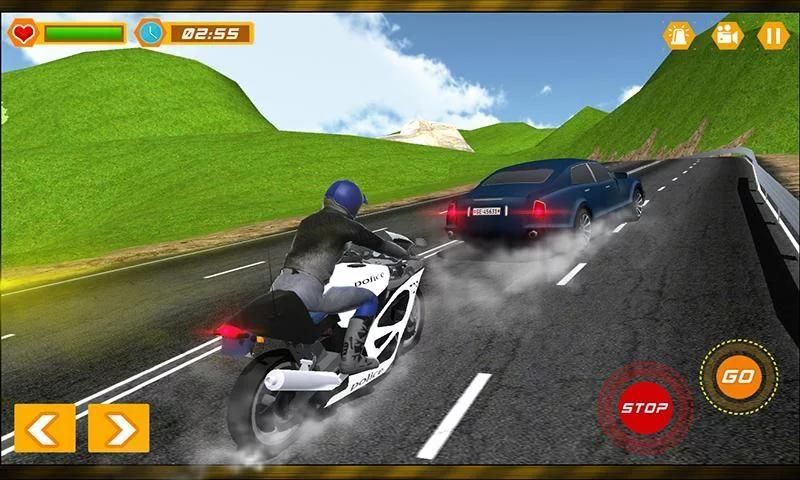 Penjahat melarikan diri di kota ghetto dan sopir mobil polisi tidak bisa mengemudi di jalan-jalan sempit. Polisi scanner pelacakan rute mereka naik sepeda motor polisi untuk membawa mereka ke bawah. Menjadi polisi nyata moto rider, melakukan stunts sepeda berisiko untuk menghentikan pelarian kriminal dan cadangan tidak ada belas kasihan pencuri badass. Ada sebuah perampokan bank besar di kota urban. Menangkap geng mafia mobil di polisi sepeda motor dan menembak mereka semua. Waspadalah terhadap serangan balik senapan serangan oleh penjahat superfast mobil jalan. Jangan biarkan mereka atap gangster melarikan diri dan mengambil kendali kota besar di tangan Anda sekali lagi.