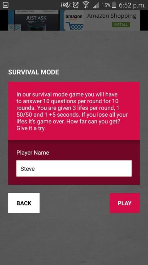 mode Survival - 10 putaran dari 10 pertanyaan, 3 kehidupan dan 2 jalur kehidupan per putaran. Seberapa jauh bisa Anda membuatnya melalui mode bertahan hidup.