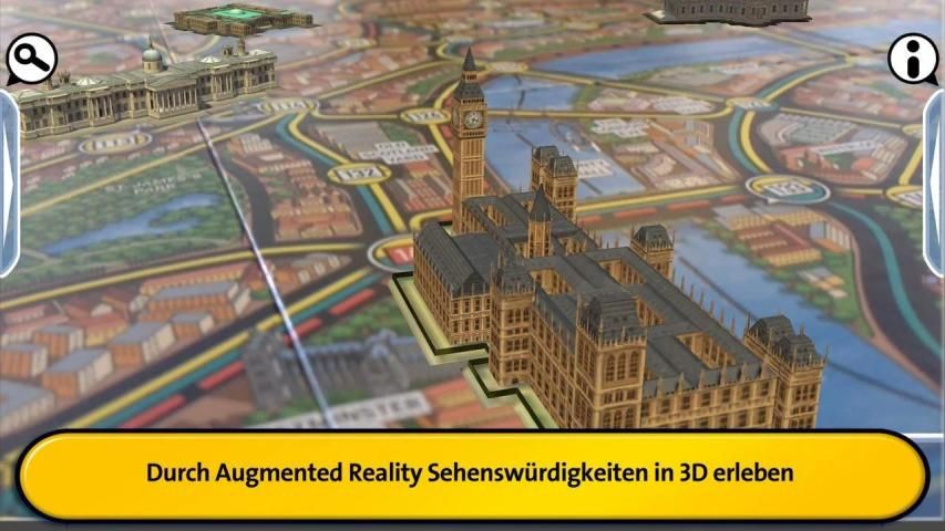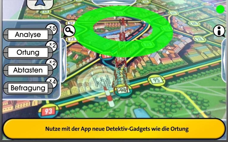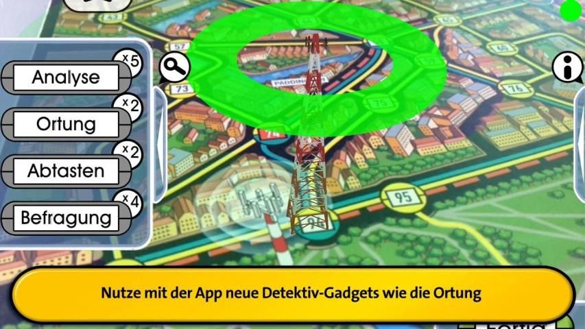 Sie wählen zum Beispiel die Handyortung und richten die Kamera des Smartphones oder Tablets auf die vier auf dem Spielplan verteilten Funkmasten. Grüne, gelbe oder rote Funkwellen zeigen, ob Mister X sich in der Nähe aufhält oder nicht. Eine weitere Möglichkeit ist die Zeugenbefragung an bedeutenden Bauwerken der Metropole. Wieder kommt die Kamera zum Einsatz und lässt Tower Bridge, Houses of Parliament oder St. Paul‘s Cathedral in 3D erscheinen. Zeugen verraten, ob Mister X sich dort befindet oder vor kurzem hier war.
