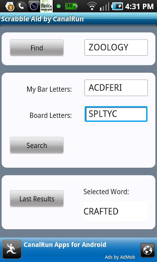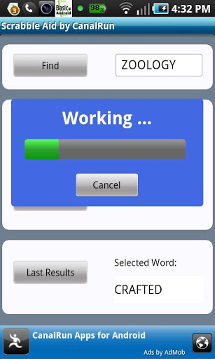 Scrabble Aid is an app that will help you become a better Scrabble player. It will check to be sure a word is in its scrabble dictionary, and it will find the anagrams for available Board and Bar letters. it sorts its results by word score and length, although it does not account for double and triple squares.This app has a very simple and intuitive interface. It even allows you to cancel its anagram search function, which can take a minute or two.Instructions:Scrabble Aid opens to the main quot;search amp; findquot; page. In the top section on the main page, tap in the edit box adjacent to the Find button. The keypad will open Hint: you can enter words and letters using Android39;s Voice Recognition interface. Enter a word and press Find. A dialog will show confirming quot;Foundquot; or quot;Not Foundquot;. Add the letters from your Bar and the playable letters from the Board into the two edit boxes in the middle section. Use the question mark, quot;?quot;, character in the bar letters to represent the wildcard gamepiece. The anagram search result will contain one of the letters from the list of Board letters. In addition, as many Bar letters as possible are used to complete the anagram. Press Search. A dialog with a progress bar and a cancel button will appear. Press the Cancel button to stop the search. When the search completes, you are taken to the Results page and shown a list of the anagrams found, with their word scores. Tap one of the words to select it, or perform a long click to open the Result Actions dialog. You will be brought back to the main page and the selected word is shown in the bottom section. Clicking Last Results will bring you back to the Results page.Visit the CanalRun Android home page at android.canalrun.com to view all of the android applications from CanalRun.Scrabble is a registered trademark owned in the United States and Canada by Hasbro, Inc., and in Great Britain and everywhere else in the world, by J.W. Spear amp; Sons PLC, a subsidiary of Mattel.