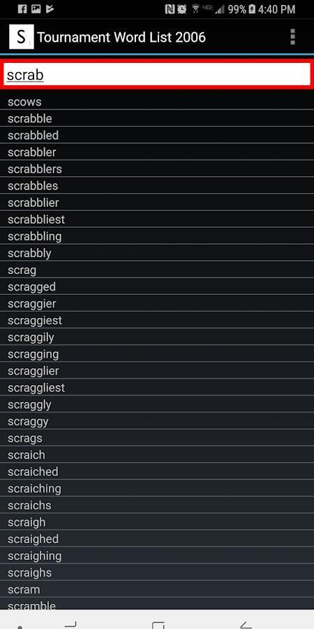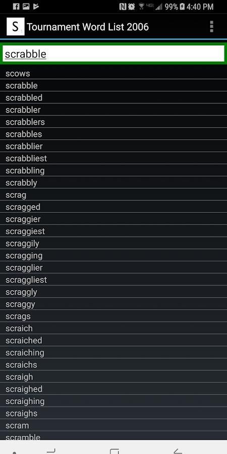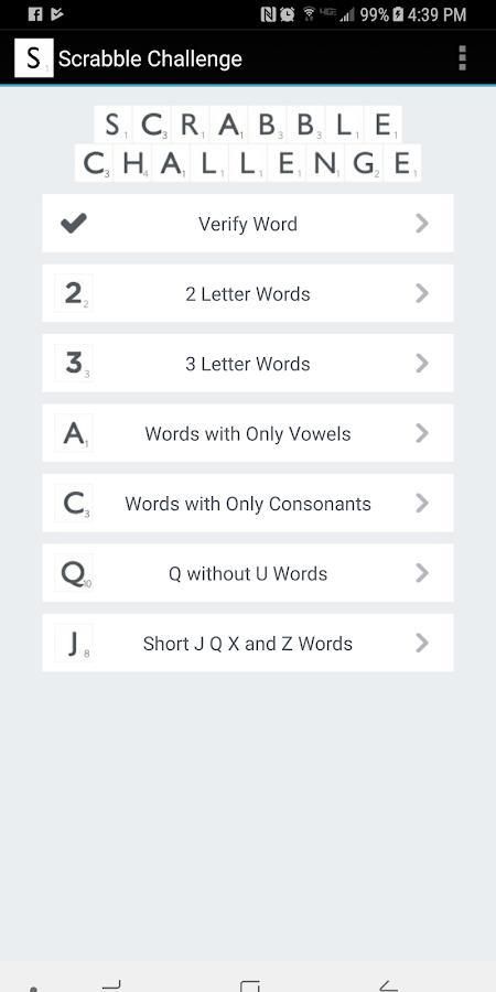 - Banyak bantuan daftar dimasukkan untuk meningkatkan bermain game, termasuk Semua kata-kata 2 dan 3 huruf Hari, Q tanpa kata-kata U dan pendek J Q X dan Kata Z.
